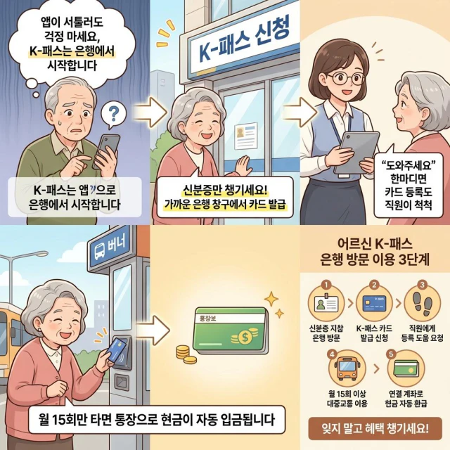 스마트폰 앱 설치가 어렵다면 신분증을 들고 가까운 은행 창구에 방문하여 K-패스 카드를 만들고 등록 도움을 받으시면 됩니다.