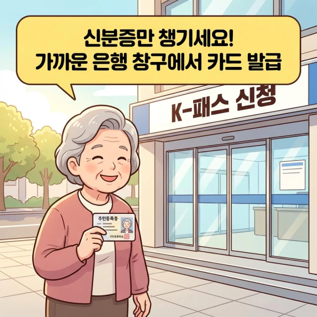 K-패스를 이용하려면 먼저 전용 카드가 있어야 합니다. 앱으로 신청하는 게 어렵다면 집 근처에 있는 신한은행, 우리은행, 하나은행, 국민은행, 농협 등 평소 거래하시는 은행 창구로 가시면 됩니다. 이때 꼭 챙겨야 할 것은 본인의 신분증입니다.