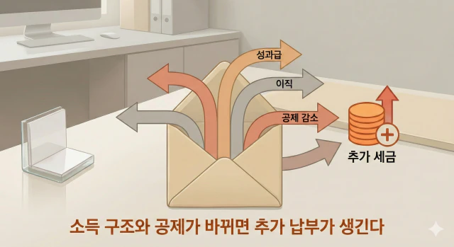 연봉은 비슷해 보여도 성과급이나 인센티브가 늘어나면 과세 대상 소득이 증가합니다. 이 과정에서 세금이 충분히 원천징수되지 않았다면 추가 납부가 생길 수 있습니다. - 이직·중도 입퇴사