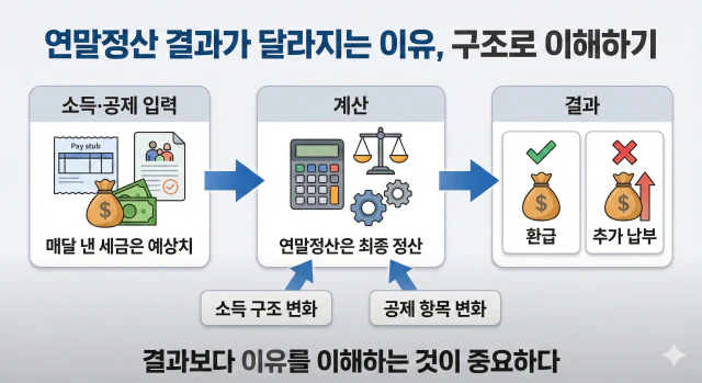 연말정산은 보너스를 주는 제도가 아니라, 1년 동안 미리 낸 세금이 정확했는지 다시 계산하는 과정입니다.