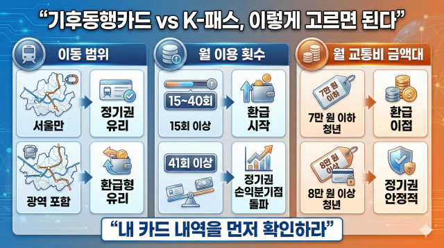 월 이동 횟수 40회를 기점으로, 지하철 전용은 기후동행카드가 유리하고 광역버스나 장거리 이용자는 K-패스의 환급 혜택이 더 큽니다.
