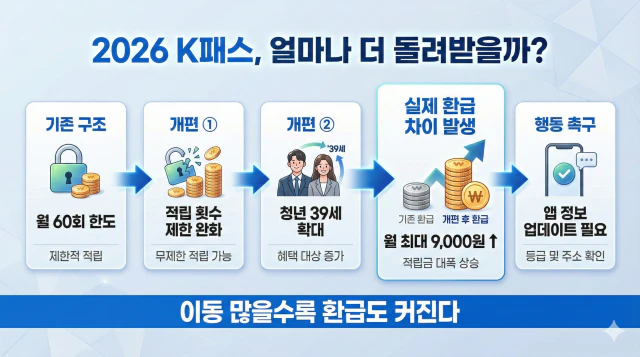 결론부터 말하면, 2026년형 K패스는 적립 횟수 한도가 사실상 폐지되고 청년층 지원 범위가 확대되어, 이동량이 많은 분은 월평균 1만 원 이상의 추가 환급을 기대할 수 있습니다.
